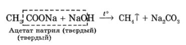 В пробирку поместите выданную учителем смесь безводного ацетата натрия и натронной извести в соотношении 1:2. Пробирку закройте пробкой с газоотводной трубкой и закрепите наклонно вверх в лапке штатива. Содержимое пробирки нагрейте в пламени спиртовки. Напишите уравнение протекающей реакции.