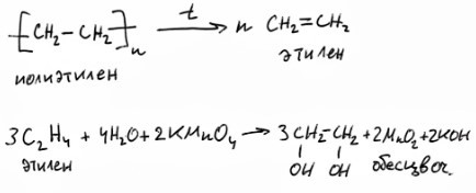 Уравнение: C₂H₄ + Br₂ → C₂H₄Br₂ - С перманганатом калия: Происходит мягкое окисление (реакция Вагнера). Марганцовка расходуется на образование двухатомного спирта, из-за чего фиолетовый раствор обесцвечивается и выпадает бурый осадок.
