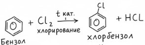 (Бензол + Хлор —> Хлорбензол + Хлороводород)