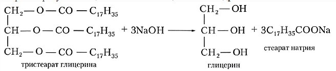 (тристеарат глицерина + гидроксид натрия → глицерин + стеарат натрия)