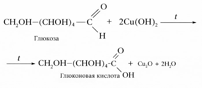 В этой цепочке глюкоза проявляет восстановительные свойства, характерные для альдегидов. При нагревании с гидроксидом меди(II) альдегидная группа глюкозы окисляется до карбоксильной группы (-COOH). Визуально это сопровождается выпадением кирпично-красного осадка оксида меди(I).