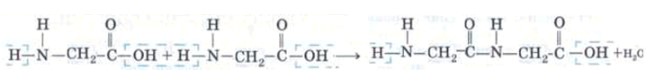 Взаимодействие двух молекул глицина (реакция поликонденсации). Отщепляется молекула воды и образуется дипептид — глицилглицин.