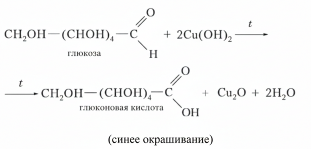 Глюкоза реагирует с гидроксидом меди(II) в два этапа. Сначала (без нагревания) она ведет себя как многоатомный спирт, образуя ярко-синий раствор. При нагревании же происходит окисление альдегидной группы.
