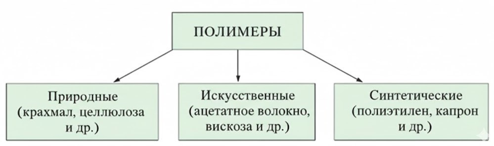 В зависимости от их происхождения полимеры подразделяют на три основные группы: природные, искусственные и синтетические. Природные полимеры встречаются в природе без вмешательства человека (например, крахмал, целлюлоза). Искусственные полимеры представляют собой изменённые человеком природные материалы (такие, как ацетатное волокно, вискоза). Синтетические полимеры создаются полностью человеком и не встречаются в природе (например, полиэтилен, капрон).