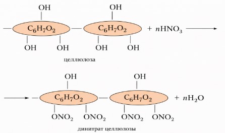 В качестве примера можно рассмотреть нитроцеллюлозу. Этот искусственный полимер получают из природной целлюлозы. Целлюлоза — это полимер, состоящий из повторяющихся звеньев с формулой C₆H₇O₂(OH)₃, где каждая молекула содержит гидроксильные группы (–OH). При взаимодействии целлюлозы с азотной кислотой (HNO₃) происходит замещение гидроксильных групп нитрогруппами (–ONO₂). В результате образуется нитроцеллюлоза, в которой гидроксильные группы заменены на нитрогруппы, что меняет её химические и физические свойства.